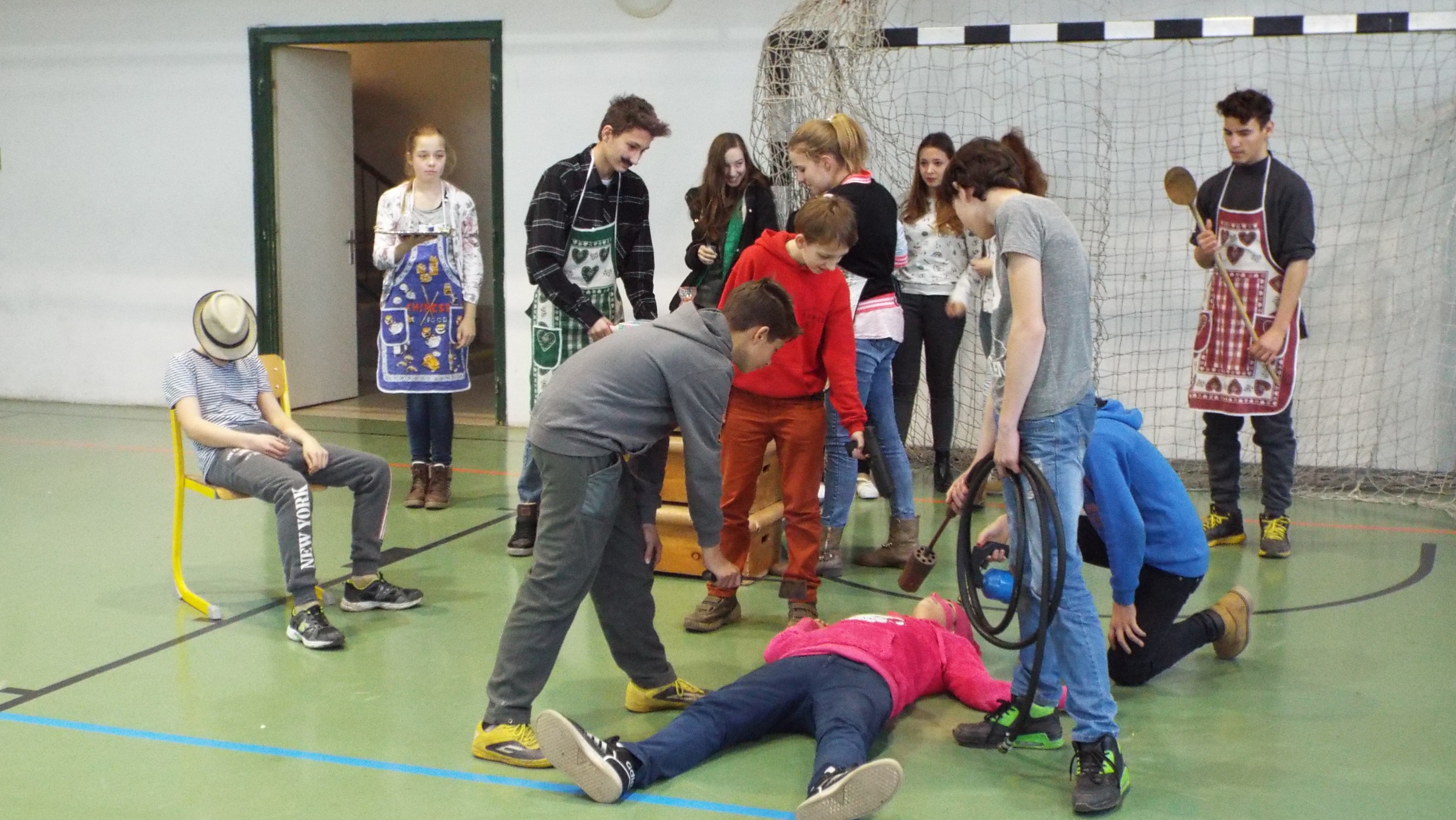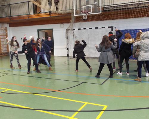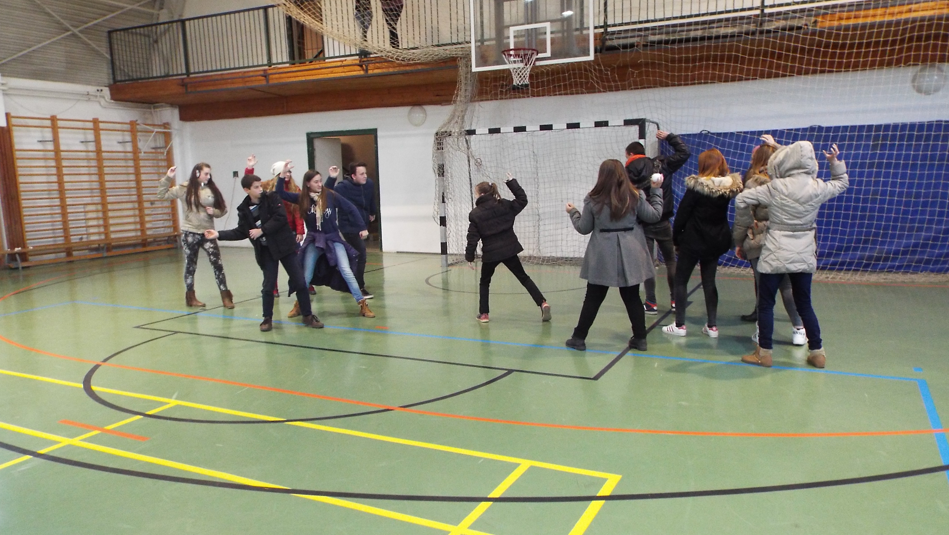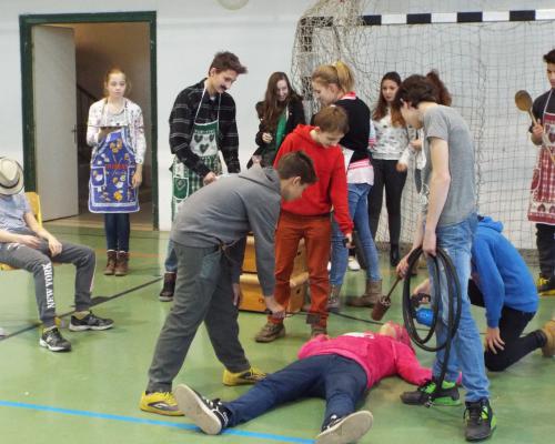A táncosokkal a Kankalin néptáncegyütteshez látogattunk el. A foglalkozás a népi játékokkal kezdődött. Két részre szedték a gyerekeket és váltóversenyt játszottak. Különböző egyensúlyozós eszközökkel kellett a gyerekeknek járkálniuk. (gólyaláb, üveg)